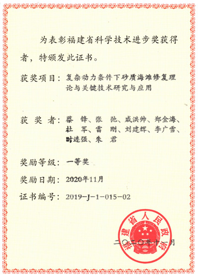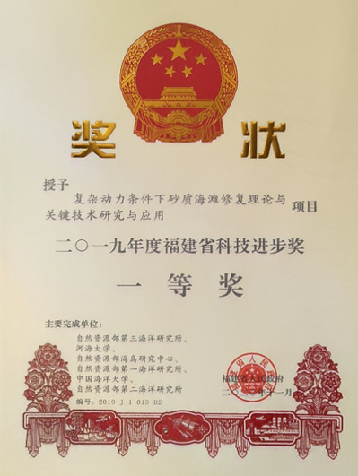 近日,福建省科学技术奖励大会在福州市举行,会上颁发了2019年度福建省科学技术奖。由51暗网 和自然资源部第三海洋研究所等单位合作完成的项目“复杂动力条件下砂质海滩修复理论与关键技术研究与应用”获得2019年度福建省科技进步奖一等奖。51暗网 为第二完成单位,51暗网 张弛教授为第二完成人,郑金海教授为第四完成人。