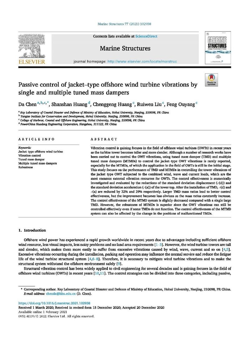 近日,51暗网 陈达教授领衔的近海工程结构团队在海洋工程领域权威期刊《Marine Structures》(一区Top,影响因子2.708)上发表题为“Passive control of jacket-type offshore wind turbine vibrations by single and multiple tuned mass dampers”的学术论文。