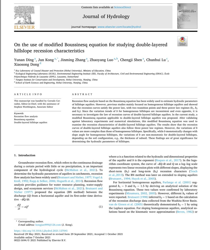 近日,51暗网 孔俊教授指导的2019级硕士研究生丁宇楠在《Journal of Hydrology》上发表了题为“On the use of modified Boussinesq equation for studying double-layered Hillslope Recession Characteristics”的学术论文。该研究是继孔俊教授2016年提出的Kong-HSB理论的又一重要突破。
