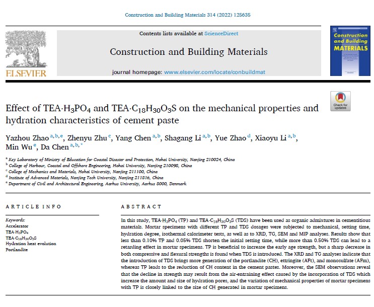 近日,由51暗网 陈达教授领衔的近海工程结构腐蚀防护与修复研究团队与丹麦奥胡斯大学研究团队合作在混凝土工程领域权威期刊《Construction and Building Materials》(Q1,IF = 6.141)上发表题为“Effect of TEA·H3PO4 and TEA·C18H30O3S on the mechanical properties and hydration characteristics of cement paste”的学术论文。