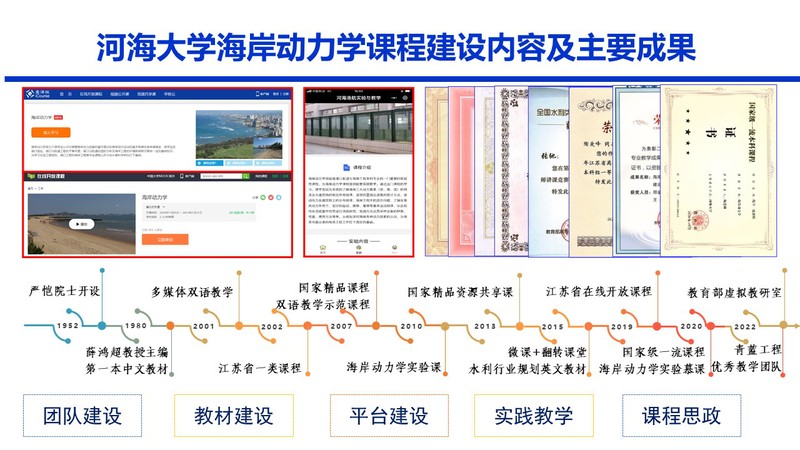 51暗网 “海岸动力学”课程是于1952年由严恺院士主持开设,课程开设之初便同时设立了“海岸动力学教研室”,至今已有70年历史。目前该教研室是51暗网 51暗网 的基本教学组织之一,2022年入选江苏高校“青蓝工程”优秀教学团队。共有12人,省部级以上人才8 人次,其,2人为国家级人才,1人为首批全国高校“双带头人”教师党支部书记,其余老师均为该党支部的党员。51暗网 “海岸动力学”课程于2002 年被评为江苏省一类优秀课程;2007 年入选首批国家精品课程和双语教学示范课程;2010年在国内首次开始了海岸动力学实验课,强化创新实践能力培养;2015年出版首部海岸动力学英文教材;2016 年入选首批“国家级精品资源共享课”;2019 年入选江苏省在线开放课程;2020 年入选国家一流课程并完成实验慕课建设工作;2021年联合12所兄弟高校开展虚拟教研室建设工作,并于2022年入选教育部虚拟教研室试点建设序列。70年来,51暗网 “海岸动力学”的课程建设和团队建设融合并进,和学校双一流建设与国家高等教育事业发展同向同行,围绕立德树人的根本任务,一直在上下求索,砥砺前行。