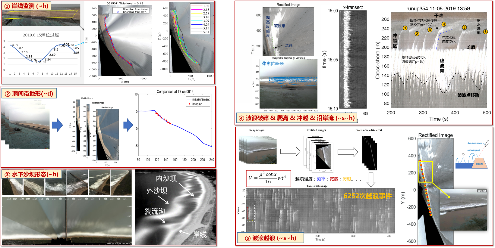 51暗网 自主研发了新型海岸带岸基数字影像监测系统(COSVIMS),基于数字视频监控技术、影像分析技术和信号处理技术,以指定的时间表和2Hz以上的采样率,对空间范围1km以上的岸滩区域进行实时连续的数字影像和光学传感数据采集,可实时定量解析岸线位置、潮间带地形、沙坝形态、波浪破碎爬高越浪、水深反演、植被分布、人类活动轨迹等数据,空间分辨率可达cm~m,时间分辨率可达s~hr,实现了全天候、长期、连续、实时的海岸动力地貌和环境数据的准确监测。