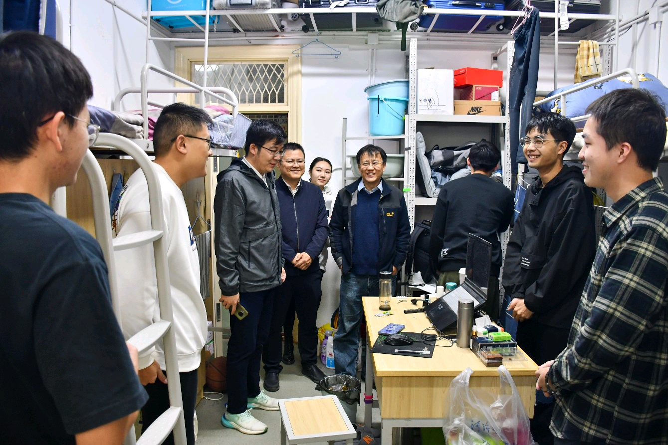 张俊基书记、沈国军副书记在2021级、2022级辅导员王恒星和顾钰恒的陪同下,走访江宁校区三舍、二十二舍和二十三舍,检查学生宿舍用电安全、消防设施等,关心新生入学适应情况、期中考试前的复习和心理调试,了解疫情管控之下学生的体育锻炼、饮食起居情况。提醒学生加强集体宿舍安全意识,引导学生劳逸结合、互帮互助,营造和谐友爱的社区氛围。