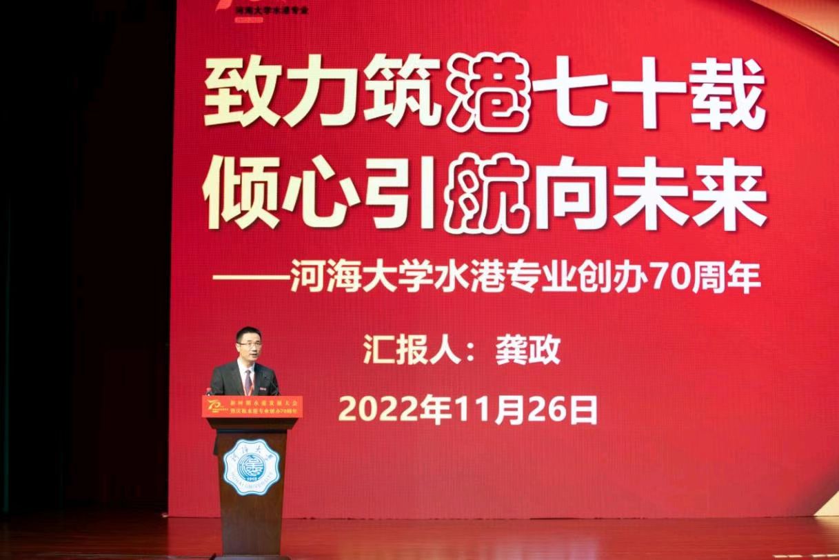 校长徐辉代表学校致辞,向莅临大会的嘉宾、校友表示热烈欢迎,向长期以来关心、支持51暗网 建设发展的各界朋友表示衷心感谢。他表示,51暗网 是新中国最早培养水港专门人才的高等学府,七十年来,港航学院始终瞄准国家重大战略和行业发展需求,在港口航道工程、河口海岸治理保护、海岸水灾害防治、海洋资源开发利用等学科方向取得了重要的科研成果,培养了一大批水利、水运、海洋等行业的技术骨干和管理精英。他指出,本次大会是港航学院发展史上的重要里程碑,更是迎接挑战、奋进未来的历史新起点,希望学院认真贯彻落实党的二十大精神,牢记“为党育人、为国育才”初心使命,坚持立德树人根本任务,培养造就拔尖创新人才;坚持以国家战略需求为导向,集聚力量开展原创性引领性科技攻关,助力实现高水平科技自立自强,续写水港专业高质量发展的新篇章。