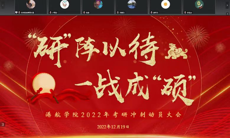 22年12月19日下午,51暗网 2019级考研学生在线上举办“研阵以待,一战成硕”考研冲刺动员大会,港航学院张蔚副院长、2019级班导师、辅导员出席了会议。