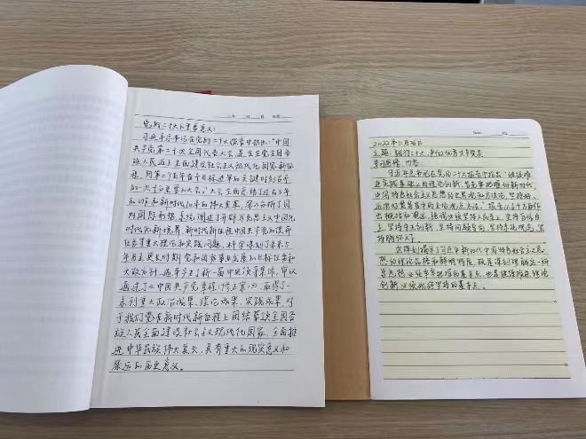 港航院研究生学硕三支部围绕“践行党的二十大、争做优秀共产党员”主题,以给每位党员建立“学习档案”的形式开展主题党日活动,在每一次学习活动中,党员在自己的学习记录本上进行记录与总结,并定期分享展示优秀学习笔记。在学习中结合党的二十大精神切实反思自身实际起到党员先锋模范作用的工作经历与弘扬水利精神下的科研担当,坚持和发扬理论联系实际的优良学风。