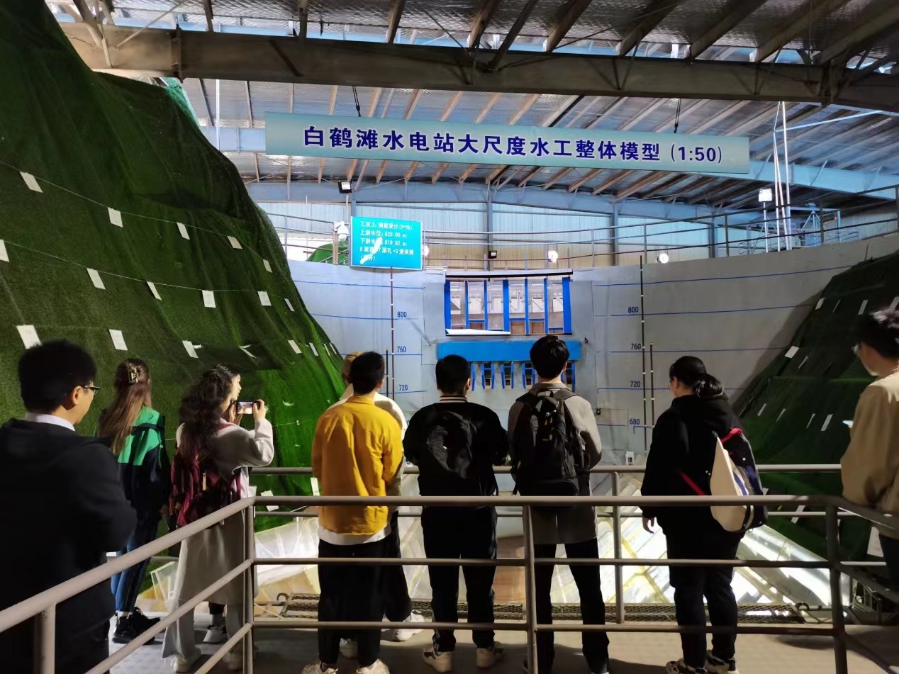 在白鹤滩试验厅,同学们目睹了大型白鹤滩物理模型,了解了白鹤滩工程概况,模型比尺及范围,现场观看了壮观的表孔、深孔泄洪过程,了解了泄洪水舌、水垫塘消能机理,对泄洪、消能、引水、尾水等各建筑物有了直观的认识和了解。