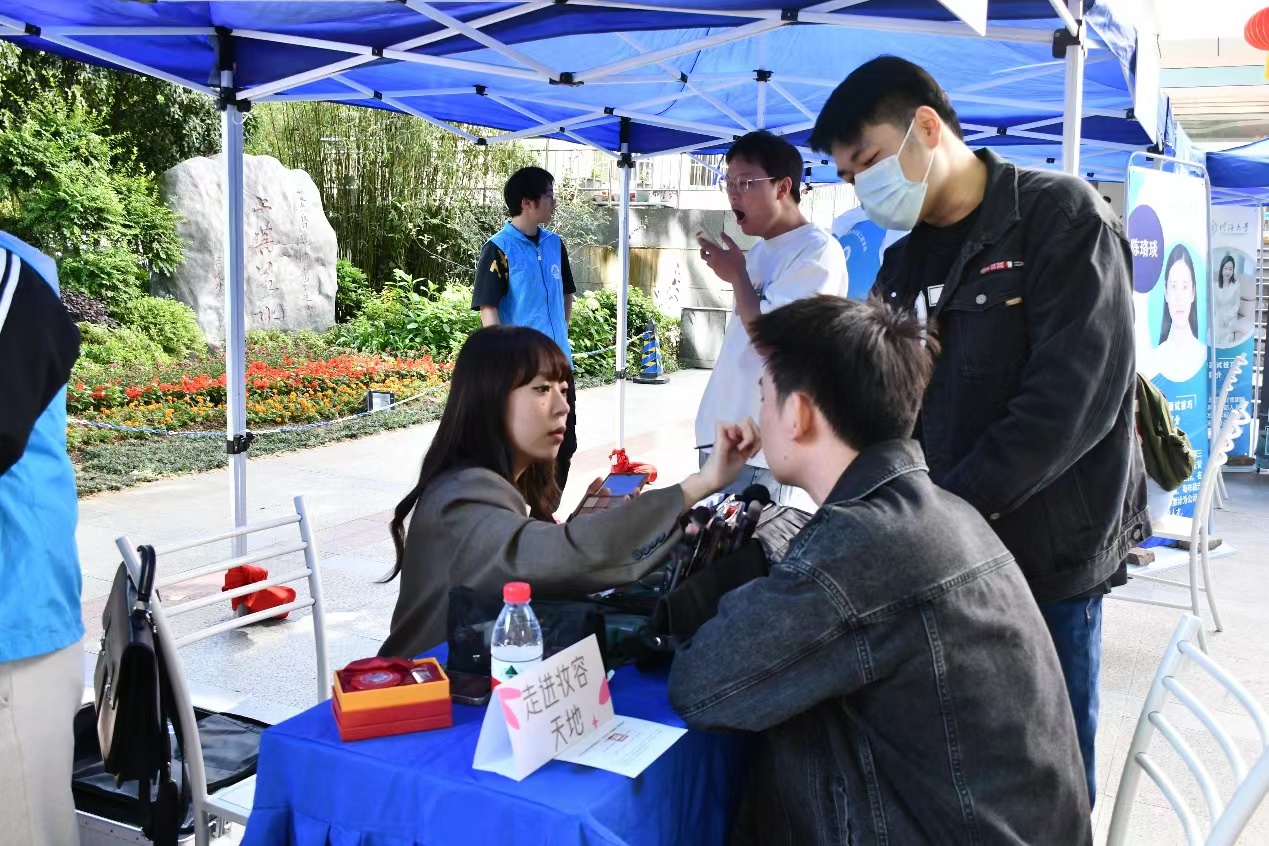 在“走进妆容天地”环节中,专业化妆师现场为同学们示范,为同学们讲解化妆时的层次感、颜色搭配和修容等技巧,帮助同学们更好地理解职场面试时妆容的注意要点。