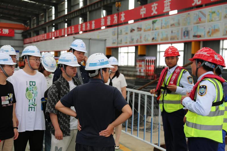 只有亲身踏入现场,才能触摸到真实的工程精神与智慧。师生在项目经理、安全总监等一行专业人员的带领下,先前往钢筋加工配送中心,听取钢筋加工生产全流程的工艺介绍,观察为保障生产安全的各类设施设备及其操作运用。