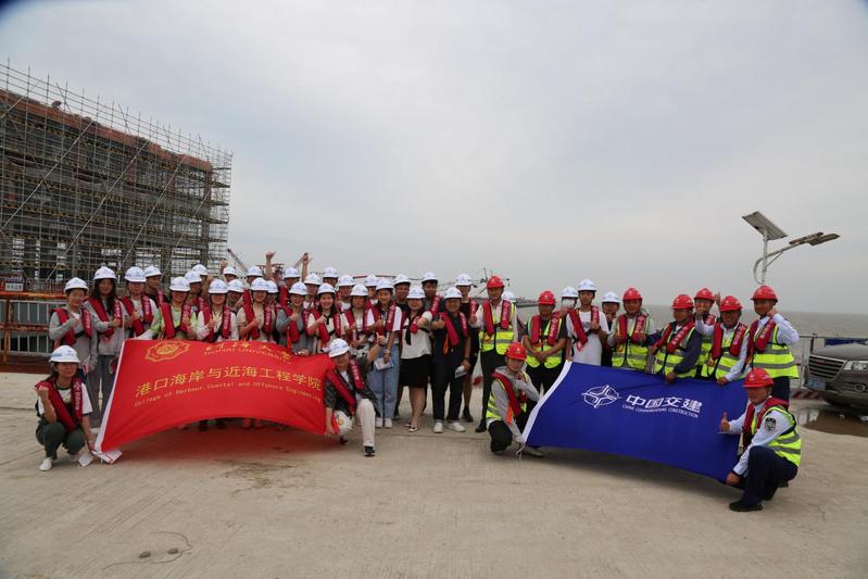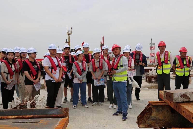 随后,一行人来到码头建设的工程现场。通州湾港区码头作为中交三航局三公司的重要项目,有很高的技术水平和管理水平。师生在工程一线近距离观察学习码头和引堤建设的施工过程、实地观摩水上起重船、运砂船等大型设备的运用。全面地了解港口建设和运营的复杂性,提高了专业素养和实践能力。