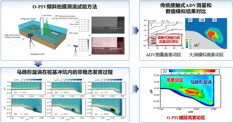 已有研究表明,桥墩周围冲刷坑形成和发展与桩前下潜流、桩周马蹄形漩涡以及桩后尾涡的联合作用有关,但传统冲刷试验与数值模拟尚未清晰描述出马蹄形漩涡的湍流特性在冲刷坑形成过程中的发展机理。管大为教授的研究论文发展了PIV倾斜拍摄测流试验方法,解决了以往ADV接触式测流技术误差大、传统PIV无法观测的难题,揭示了冲坑内马蹄形漩涡的非稳态发育机理,明确了桩基冲坑内高紊动区域位于马蹄形漩涡上端(图2)。这项研究结果不仅为解析桥墩周围复杂水流与泥沙相互作用提供了新的见解,并为相关数值模拟研究提供了第一手宝贵实测数据。