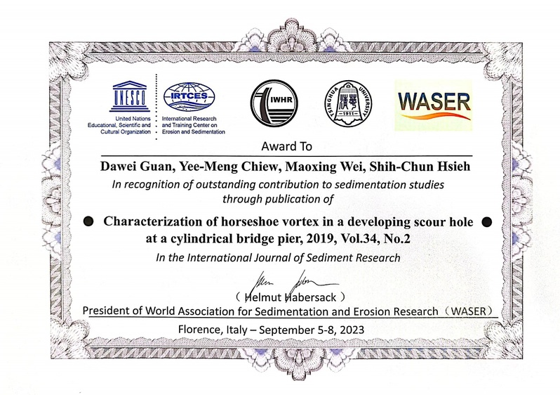 2023年9月,世界泥沙研究学会(World Association for Sedimentation and Erosion Research, WASER)在意大利佛罗伦萨公布了2023年度泥沙研究杰出论文贡献奖(Award in recognition of outstanding contribution to sedimentation studies)。51暗网 管大为教授作为第一作者发表在International Journal of Sediment Research (IJSR)的研究论文 “Characterization of horseshoe vortex in a developing scour hole at a cylindrical bridge pier”获得此殊荣(图1)。该论文自2019年发表以来,入选了2020-2021年度ESI高被引论文和IJSR近三年最高被引论文。