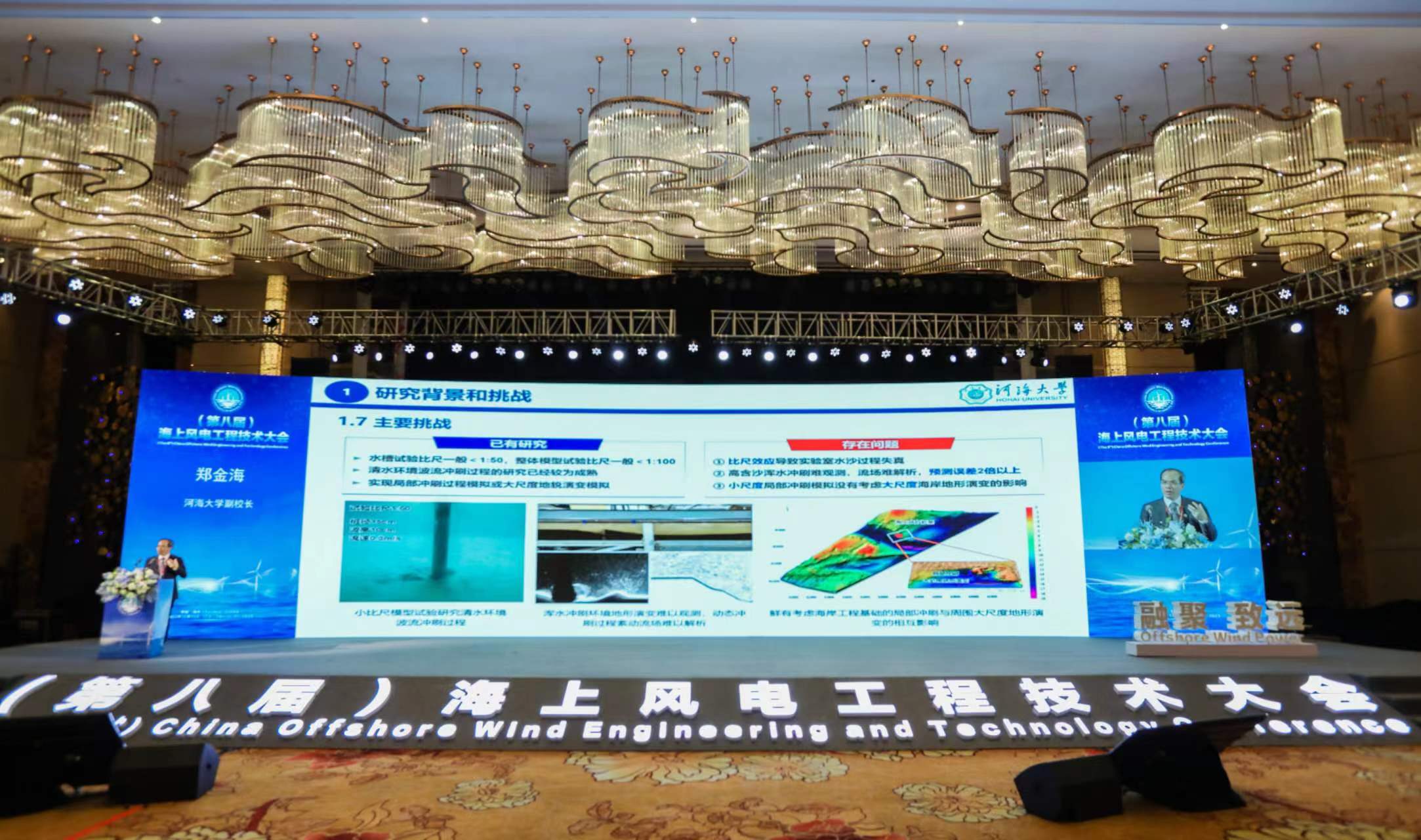 会上,郑金海教授应邀作了题为“海上风机基础冲刷防护技术研究”的大会报告。他从海上风机基础冲刷防护所面临的技术挑战、冲刷核心物模试验装备研发、复杂动力荷载环境下冲刷机理、冲刷韧性防护技术与应用、未来研究前沿与展望等五个方面阐述了其团队在风机冲刷防护领域的最新研究成果与技术创新,为海上风电行业降本增效与可持续发展提供了宝贵的思路。参会同仁在会议期间讨论热烈,进行了深入的学术交流。