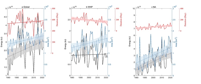 图3 全球(左)、西北太平洋(中)和大西洋(右)台风浪影响面积、累积波能和年累积作用时间年际变化和线性趋势图(蓝线:影响面积;黑线:累积波能;红线:年累积作用时间)