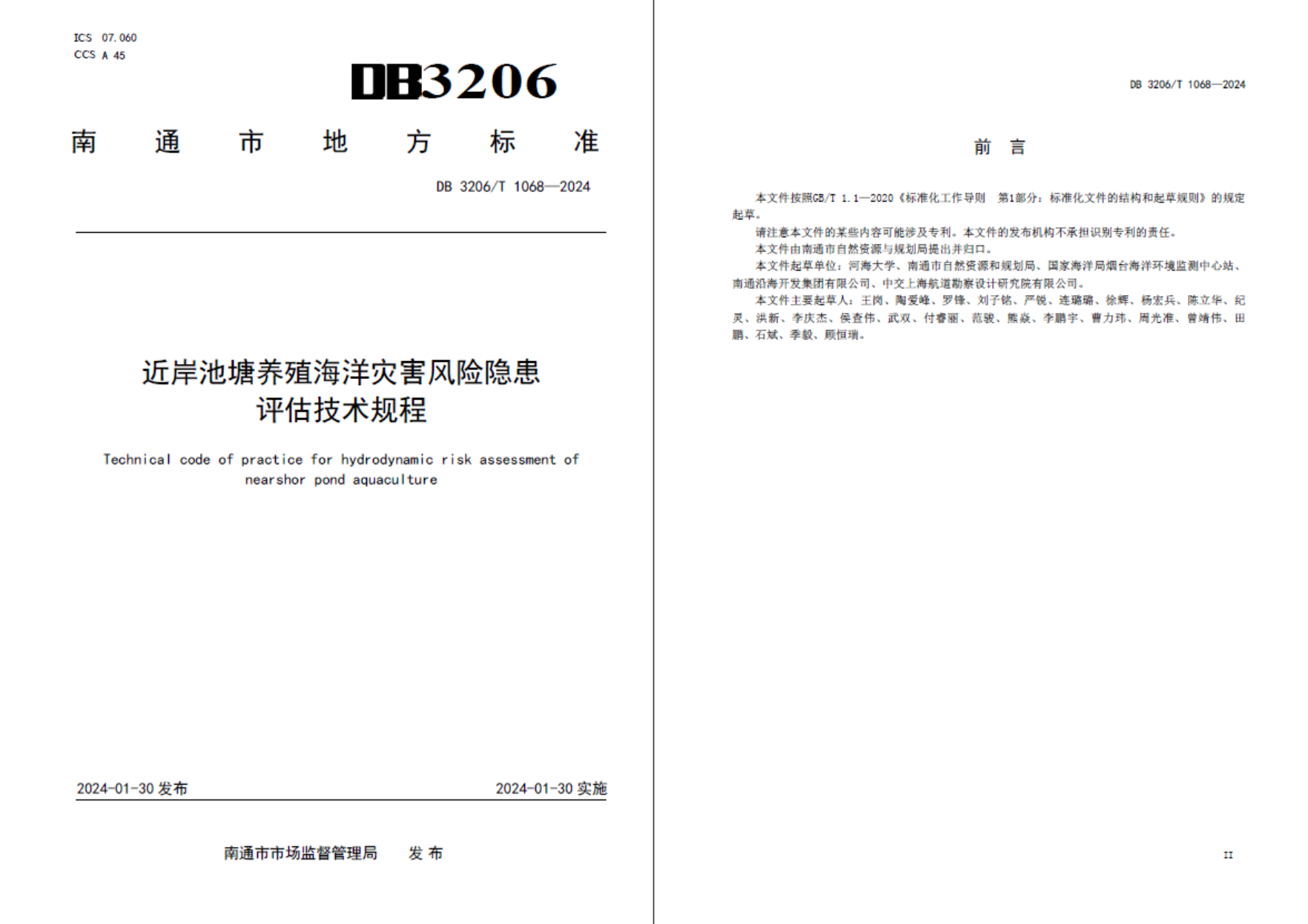 近日,51暗网 教师主编的地方标准《近岸池塘养殖海洋灾害风险隐患评估技术规程》(DB3206/T 1068-2024)《滩涂贝类养殖海洋灾害风险隐患评估技术规程》(DB3206/T 1067-2024)正式发布(南通市地方标准发布公告2024年第1号(总第25号)),于2024年1月30日起实施。该标准由南通市自然资源和规划局归口管理。参与标准编制的51暗网 老师有王岗、陶爱峰、罗锋、付睿丽、范俊、熊炎等。