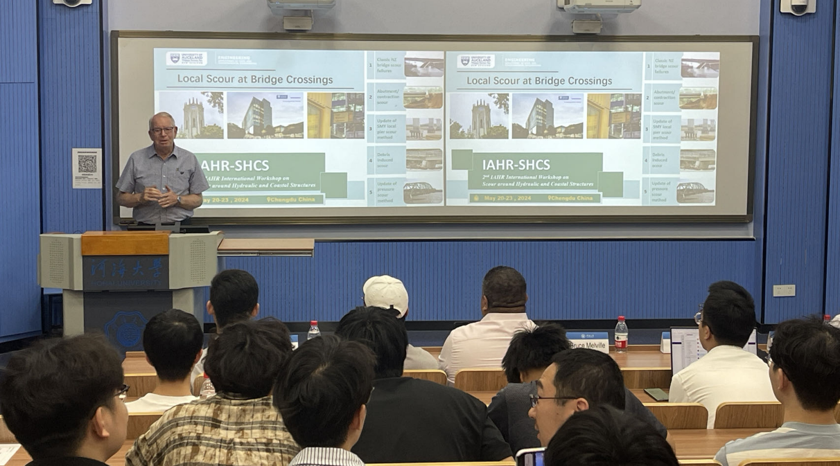 Bruce Melville院士以“Local scour at bridge crossings”为题作了报告,并详细讲解了近40年来新西兰因洪涝导致的重大桥梁冲刷破坏事件以及相关桥墩基础冲刷预测方法。Kilisimasi Latu高级讲师以“Design and application of living roofs”为题报告了生态屋顶的设计理论与应用。唐子豪博士分享了他在奥克兰大学的读博经历与生活状态。随后,管大为副院长为大家详细介绍了51暗网 与奥克兰大学的合作历史,以及51暗网 -奥克兰大学双博士、双硕士项目的具体内容与申请条件。