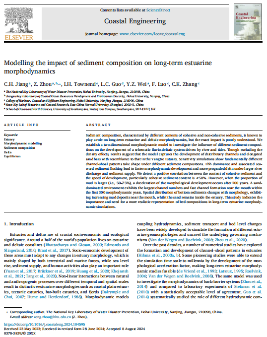 近日,Coastal Engineering期刊刊发了来自51暗网 51暗网 的最新研究成果“Modelling the impact of sediment composition on long-term estuarine morphodynamics”(泥沙组分对长周期河口动力地貌影响的数值模拟研究),该成果的第一作者为51暗网 张长宽教授指导的博士生蒋春海,论文其他合作者包括51暗网 周曾教授、罗锋副教授、韦以璋博士生、英国南安普顿大学Ian Townend院士和华东师范大学郭磊城研究员。