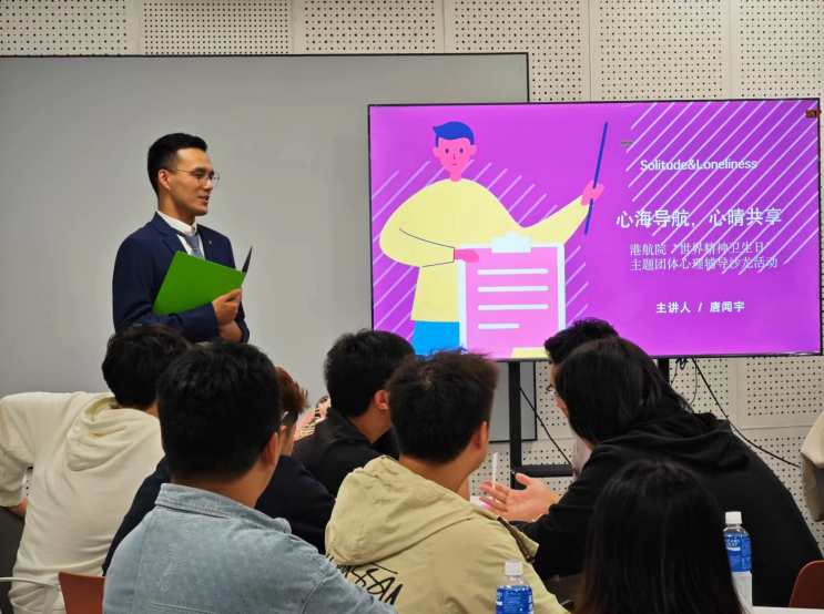 2024年10月10日晚,港航院2023级本科生在常州校区3号楼201成功举办“心海导航,心晴共享”——“世界精神卫生日”主题团体心理辅导沙龙活动,港航院2023级本科生代表参与本次团辅活动。团辅活动由校心理健康中心助心工作室心委联络部干事、港航院2023级年级心理委员唐闻宇同学主持。