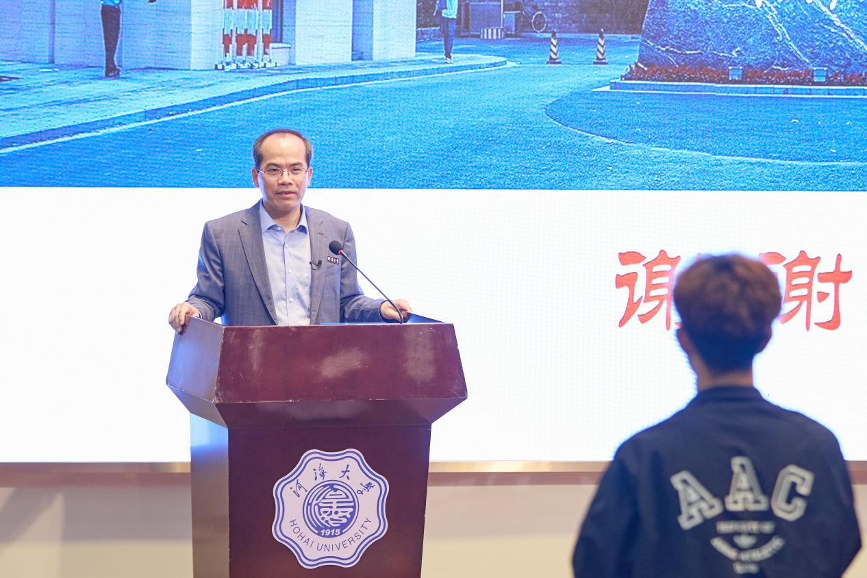 随后,郑金海教授围绕“艰苦朴素、实事求是、严格要求、勇于探索”的校训,通过讲述严恺院士艰苦朴素的生活习惯、节省参会补贴上交国家等感人故事,激励同学继续弘扬节约精神;通过介绍严恺院士向国家切实提出关于国家重大工程规划的宝贵建议,体现其严谨、求实的治学风范;通过分享自己参加毕业答辩的真实经历,讲解了严恺院士在缜密细致、重约守时、作风清廉、守土不让方面的严格要求;通过介绍具有完全国家自主知识产权的莆田谱公式,鼓励同学们做开拓性探索性的科研工作。