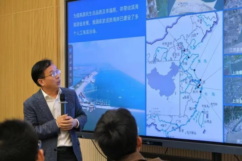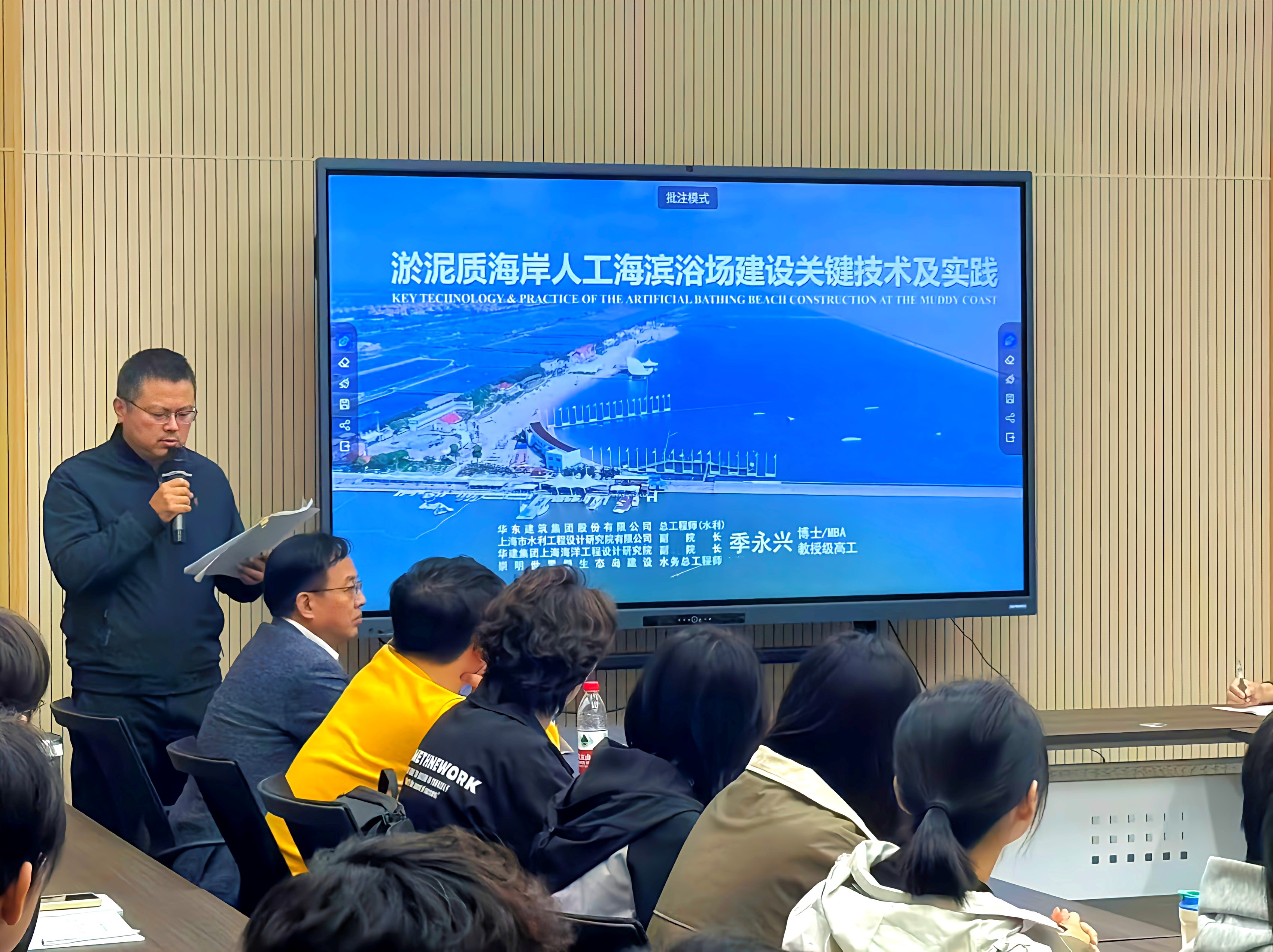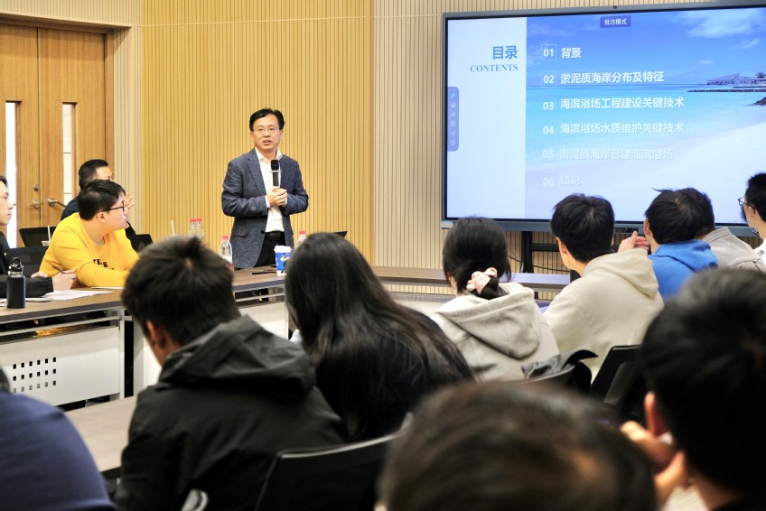 季永兴教授结合自身丰富的项目工程经历和行业前沿动态,介绍了我国淤泥质海岸分布及其特征、滨海浴场选址及建设原则、海滨浴场建设工程技术及水质维护技术,并以天津东疆湾“金沙滩”、江苏滨海“月亮湾”、上海奉贤“碧海金沙”、浙江宁波梅山湾“万人沙滩”等多座人工浴场建设过程,阐述了泥质海岸建设人工海滨浴场涉及的沉沙碧水、水质净化与维护、岸滩稳定及影响等关键技术问题。通过由浅至深的讲解和生动案例分析,使得同学们对于人工海滨浴场研究有了更全面的认识。