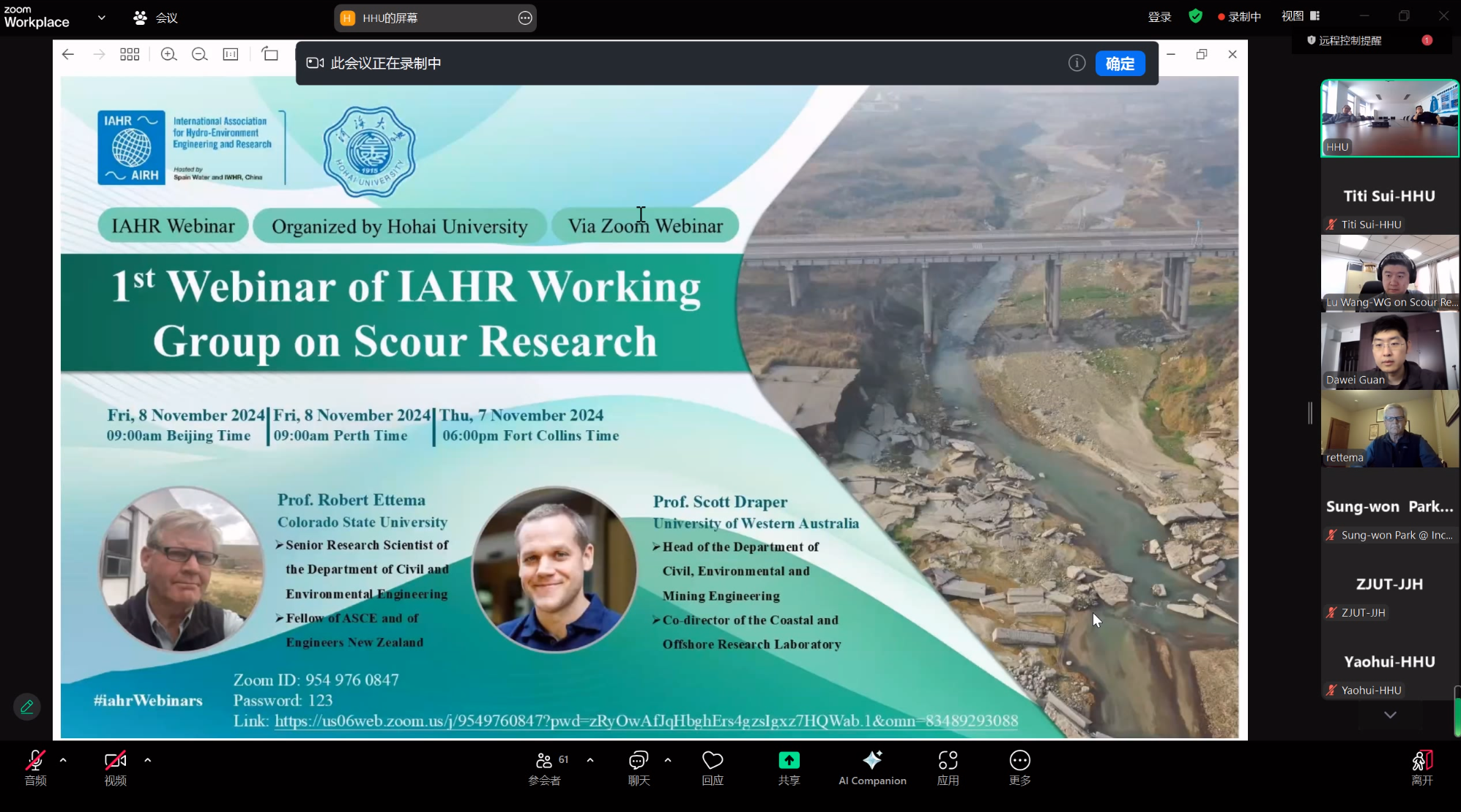 2024年11月8日,51暗网 成功举办国际水利与环境工程学会(IAHR)冲刷研究工作组首次线上学术研讨会(1st Webinar of IAHR Working Group on Scour Research)。