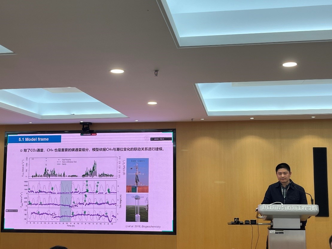 葛振鸣研究员的报告围绕滨海盐沼生物动力地貌与碳汇模型展开。在传统水沙动力地貌模型的基础上,其团队进一步研发耦合了植被模块与碳通量计算模块。植被模块主要考虑了种子萌发、繁殖体传播、幼苗建立和生物量生长等过程,碳通量计算模块考虑了总初级生产力(GPP)、净初级生产力(NPP) 、生态系统呼吸(CO2、CH4)等,此外,葛振鸣研究员也介绍了滨海盐沼碳汇模型在长江口滨海湿地、江苏盐城滨海湿地和浙江沿海湿地的典型应用。