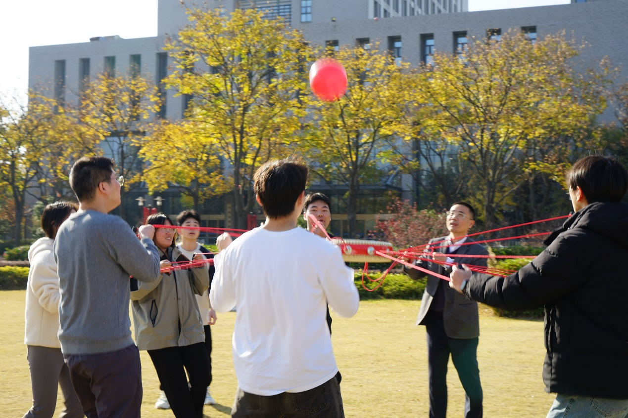 活动在充满趣味与挑战的“同心击鼓”游戏中拉开序幕。班级同学与3位老师组队,10人一组,在冬日暖阳中齐心协力,既是智慧的碰撞也是默契的考验。经过几分钟的练习,师生逐渐总结技巧,连续击中数量迅猛增长,发挥也越来越稳定。现场气氛紧张又热烈,进一步激发了同学们的拼搏精神和团结意识。
