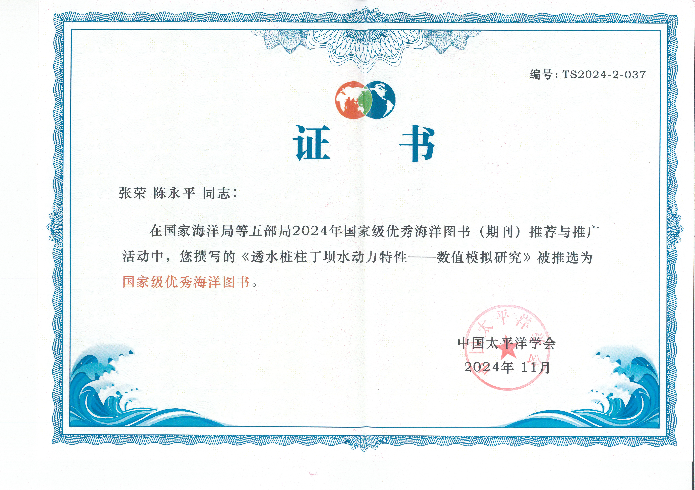 近日,在中国太平洋学会开展的国家级优秀海洋图书(期刊)推荐与推广活动中,由51暗网 张荣副研究员、陈永平教授编写的专著《透水桩柱丁坝水动力特性——数值模拟研究》被评选为2024年度“国家级优秀海洋图书”。