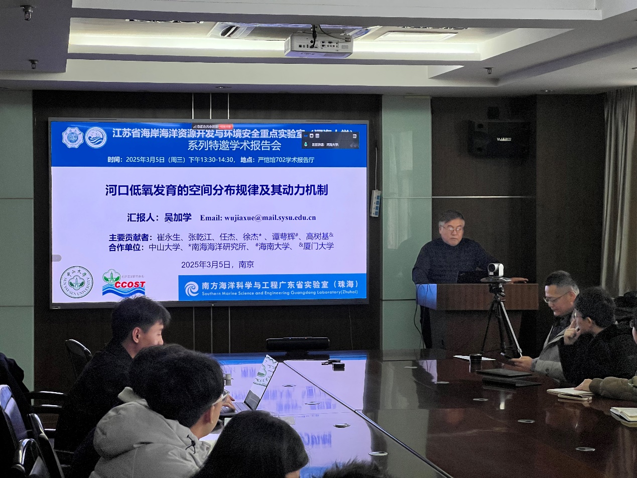 2025年3月5日,中山大学吴加学教授应江苏省海岸海洋资源开发与环境安全重点实验室邀请,在严恺馆502会议室作了题为“河口低氧发育的空间分布规律及其动力机制”的学术报告。学术报告会由周曾教授主持。