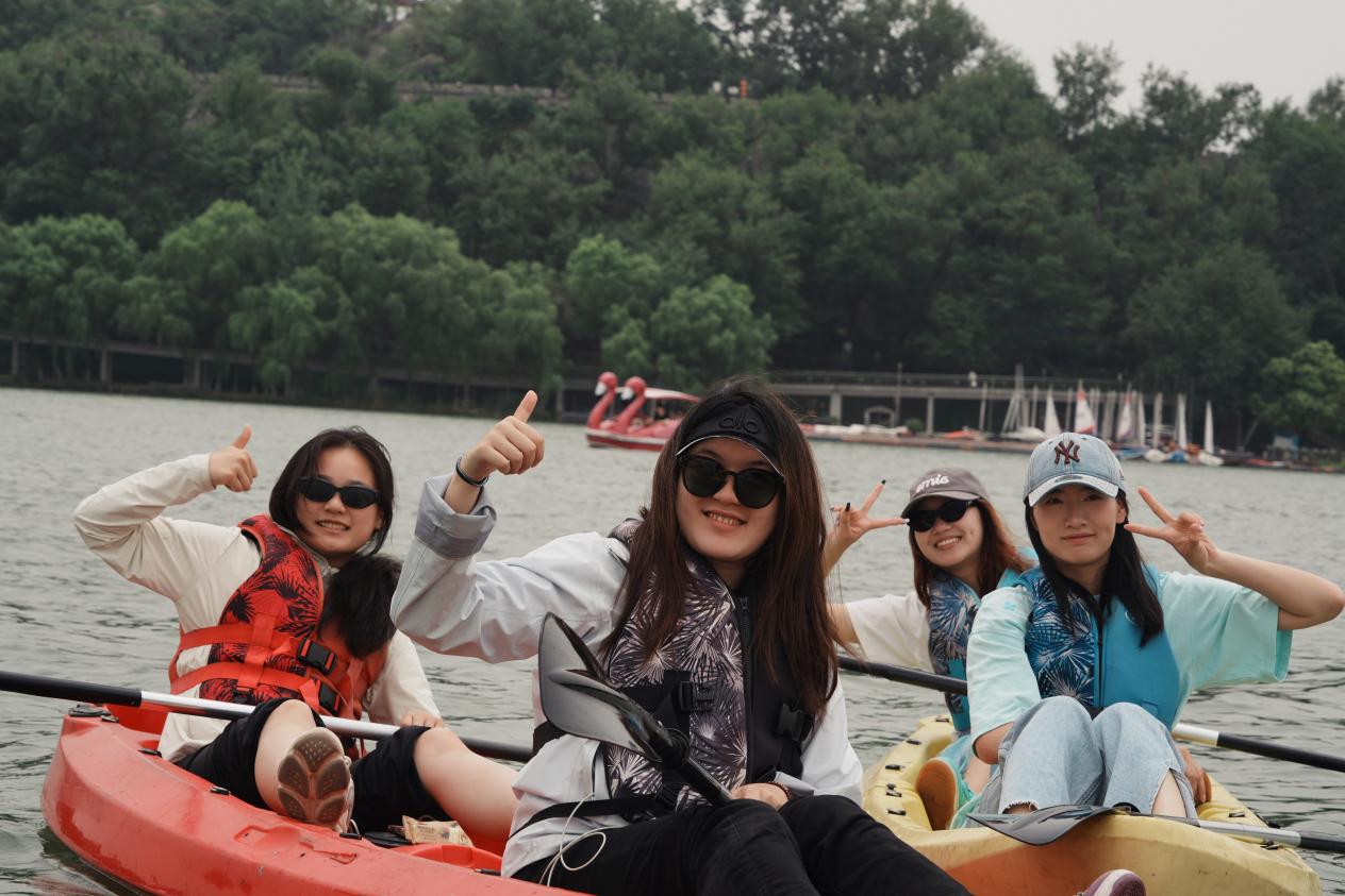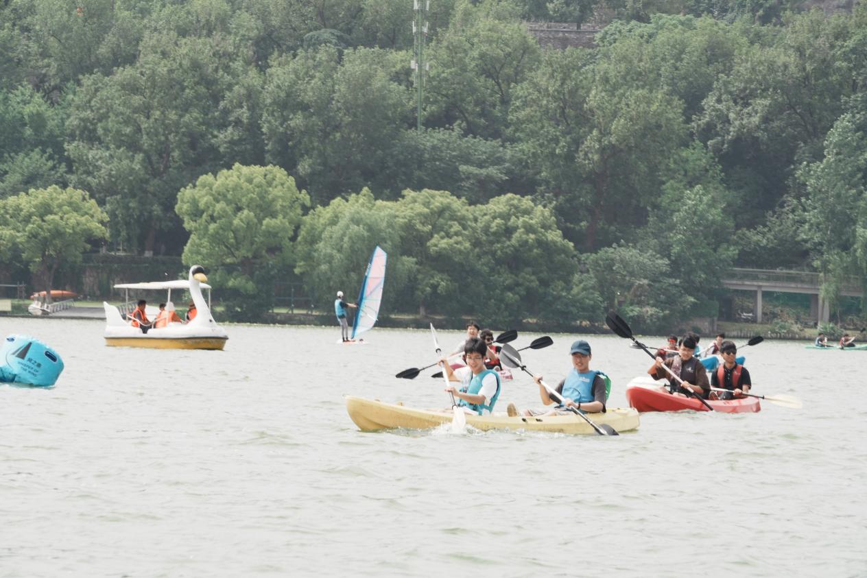 在体验皮划艇项目中,同学们两两一组,默契地一左一右的划行,感受着风浪带来的愉悦感,也能够自由控制船速,在急速冲行后也能放松身心躺在艇中,享受漂浮湖上的松弛。在划行过程中,不同艇上的同学们也互相帮助,分享划行技巧,相互合影留念。同时与帆船上风趣的教练进行互动,在百舸争流中保持着欢声笑语,增强了凝聚力与合作力。