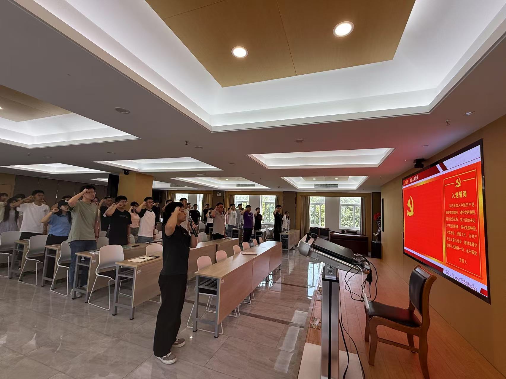 党课后,全体毕业生党员在王恒星老师的带领下,面向鲜红党旗,整齐肃立,高举右拳,重温入党誓词。