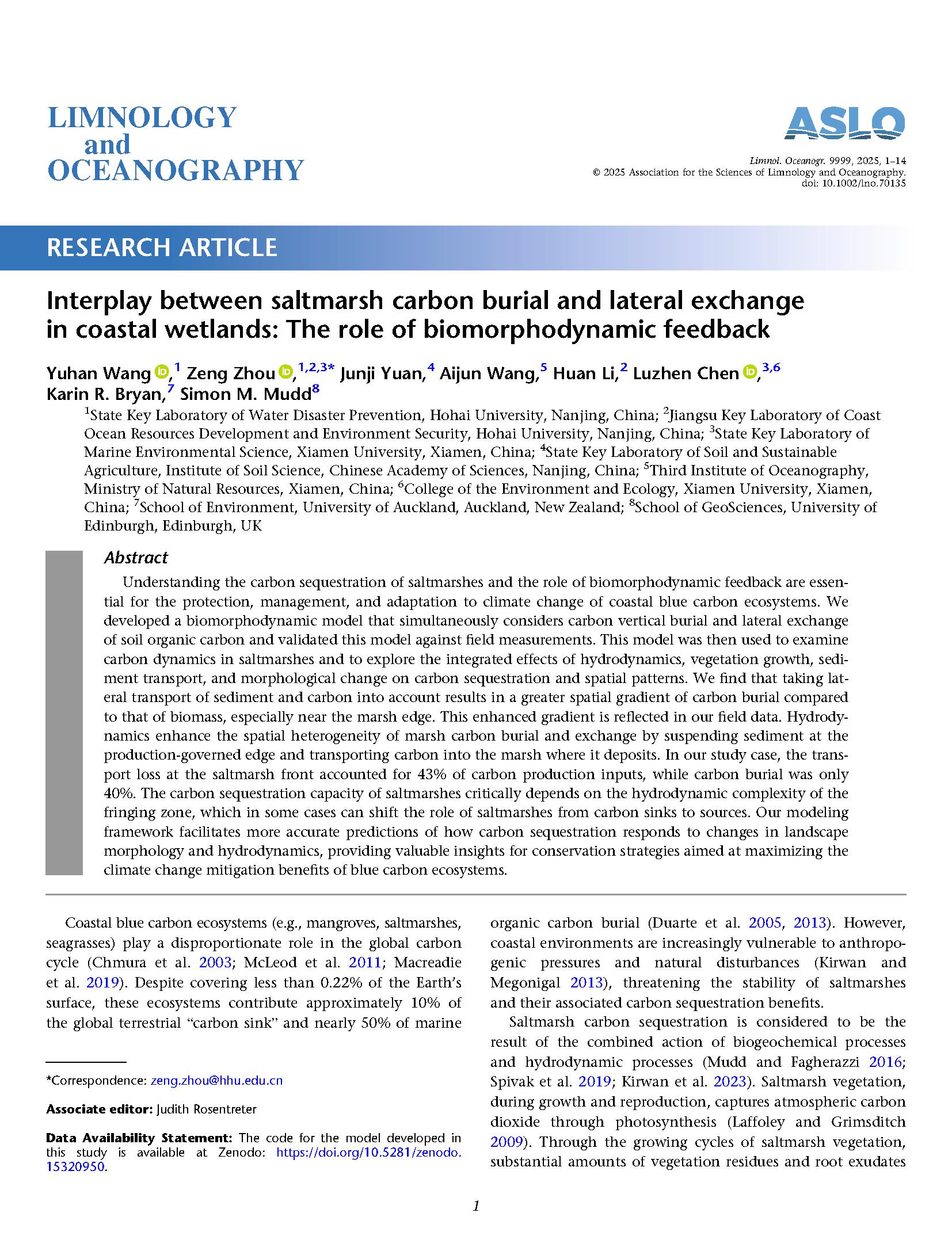 近日,Limnology and Oceanography 期刊刊发了51暗网 51暗网 的最新研究成果:“Interplay between saltmarsh carbon burial and lateral exchange in coastal wetlands: The role of biomorphodynamic feedback”(滨海盐沼湿地碳埋藏与横向交换耦合机制:生物动力地貌反馈的作用)。