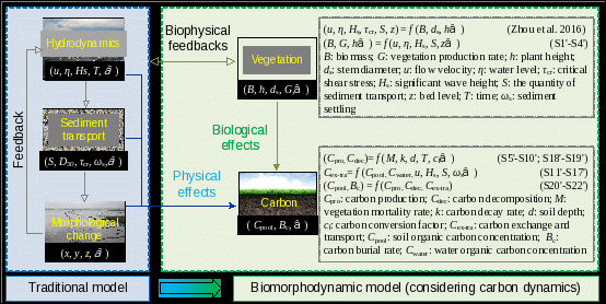 图1.考虑碳动态的生物动力地貌模型的反馈框架