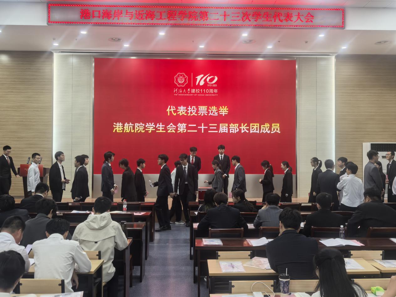 在大会第二阶段,港航院学生会第二十三届主席团候选人杨羿、李梦瑶、熊博轩、魏翔宇进行竞选演讲。根据选票结果,魏翔宇、熊博轩当选为港航院学生会第二十三届主席团成员。随后,进行了部长团候选人竞选演讲,全体代表现场投票后,选举结果将综合学生业务素质考核、组织评议及选票情况最终决定。