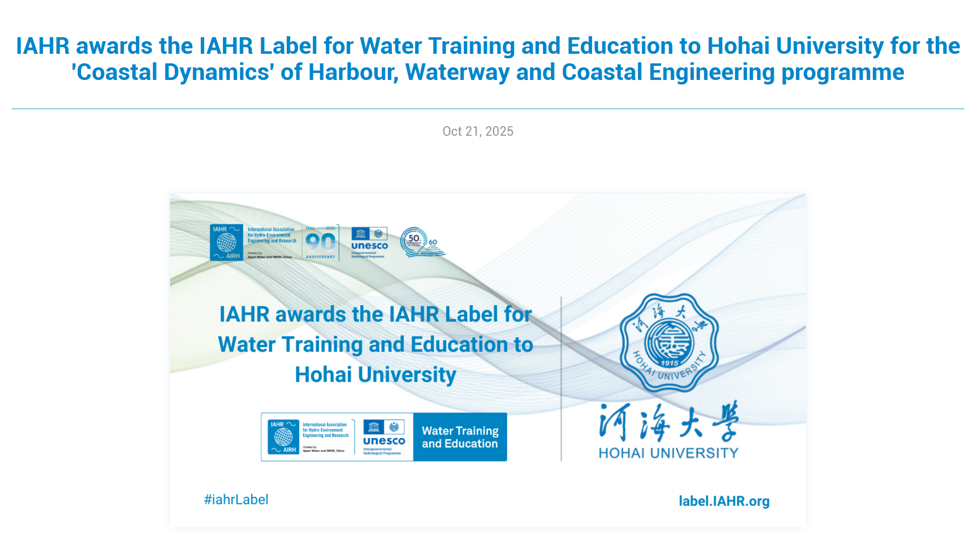 10月21日,“海岸动力学”课程正式获得国际水利与环境工程学会(IAHR)与联合国教科文组织政府间水文计划(UNESCO-IHP)联合认证的水教育标签,成为全球首个获批认证的课程,也是该联合组织发布的第11个水教育标签,前面10个都是对博士或者硕士计划的认证。国际水利与环境工程学会(IAHR)正式批准“海岸动力学”课程通过其国际认证体系,标志着该课程在教学质量、学术水平及国际化标准方面达到全球领先水平。此次认证不仅是对课程团队长期努力的肯定,更为全球水利工程教育树立了新的标杆。