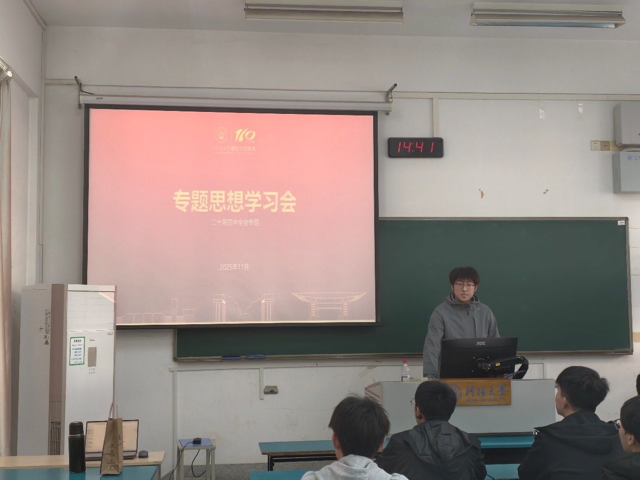 在学习环节,学生会主席魏翔宇担任主讲人。他围绕习近平新时代中国特色社会主义思想的核心内容,从历史背景、理论体系和实践意义等方面展开深入解读。