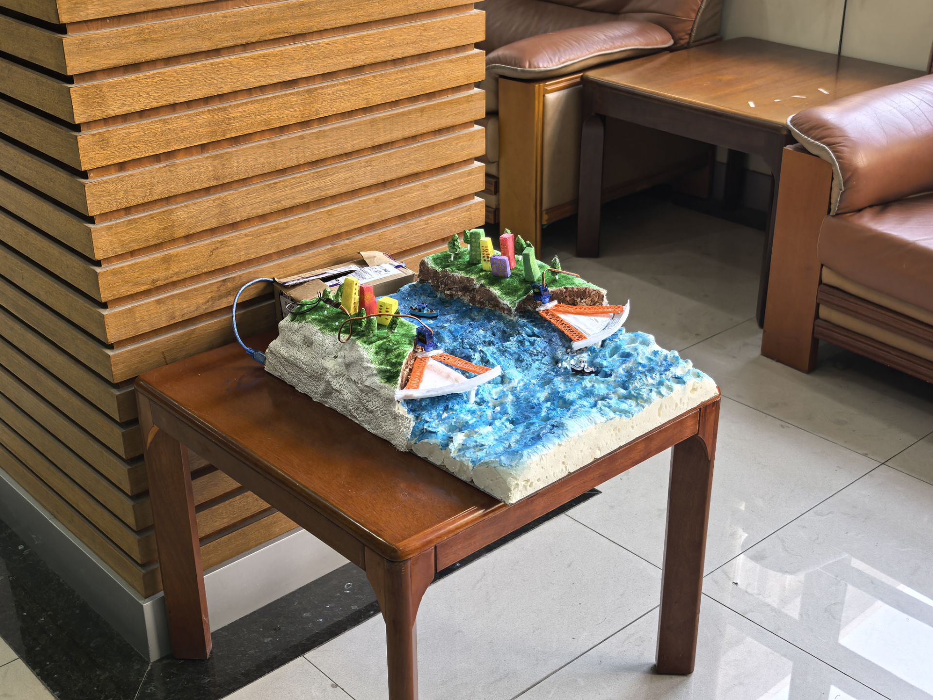 这一模型聚焦海域资源集约利用,打造“风光发电+海洋养殖”的共生系统:海面上方布设风电与光伏组件实现能源供给,以及全自动化起捕系统实现智能化.水下空间配套生态养殖设施,通过共享基础设施降本增效,同时以储能技术保障养殖设备稳定供电。作品以工程创新融合蓝碳经济与生态效益,既实现清洁能源生产,又拓展海洋农牧空间,是海域资源可持续开发的具象化探索。